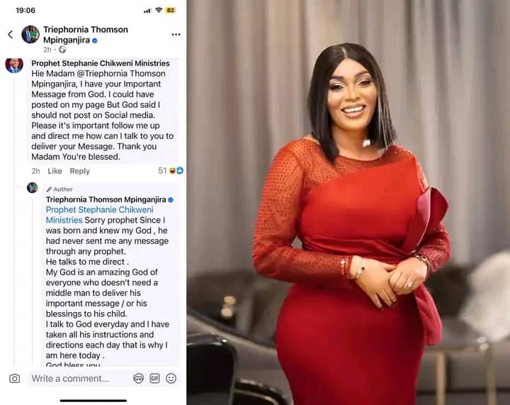 In a stunning exchange, Dr. Triphonia Thomson Mpinganjira shut down Prophet Stephanie Chikweni Ministries with a powerful response. The prophet attempted to send her a “message from God” via DM, but Madam Mpinganjira was not impressed. With unwavering confidence, she asserted her direct connection with God, stating, “He talks to me direct.”